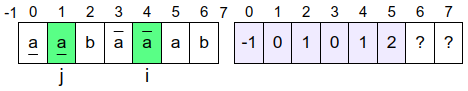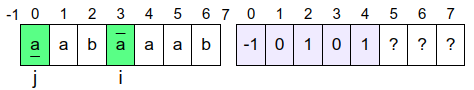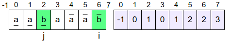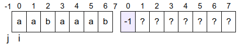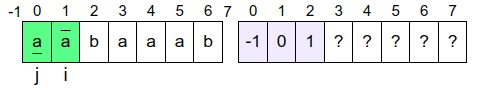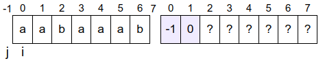 }Primer 7.6.5. Prikažimo pretprocesiranje, tj. izračunavanje najdužih prefiks-sufiksa niske \(aabaaab\). Nakon inicijalizacije promenljivih, važi \(j=-1\), \(i=0\), \(\pi_0 = -1\).