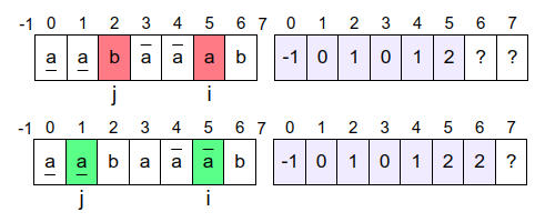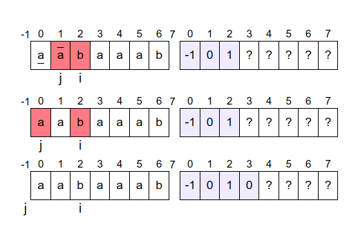 pi[2]=1) i prelazi se na određivanje vrednosti \(\pi_3\) tj. dužine najdužeg prefiks-sufiksa niske \(aab\) (tj. prefiksa niske \(p\) dužine \(3\), koji se završava na poziciji \(i=2\)). Najduži prefiks-sufiks niske \(aa\) je \(a\), ali pošto je \(p_j = p_1 = a \neq b = p_2 = p_i\), on se ne može produžiti. Zato analiziramo kraći prefiks-sufiks niske \(aa\), a to je prazna reč (postavljajući vrednost \(j\) na \(\pi_j=\pi_1=0\)). Pošto je \(p_j = p_0 = a \neq p_2 = p_i\), ni on se ne može produžiti. Postavljajući \(j\) na vrednost \(\pi_j = \pi_0 = -1\), prekidamo unutrašnju petlju i zaključujemo da je najduži prefiks-sufiks niske \(aab\) prazna niska i \(\pi_3=0\). Ovo je ilustrovano na narednoj slici.