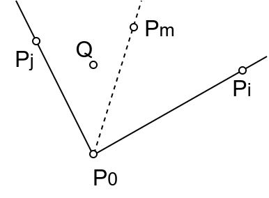 ako su tačke \(P_i\) i \(Q\) sa iste strane prave \(P_0P_m\), tj. ako su trojke \(P_0P_mP_i\) i \(P_0P_mQ\) isto orijentisane, tada tačka \(Q\) pripada uglu \(\angle P_iP_0P_m\) (tj. njegovoj unutrašnjosti). Ovaj uslov svodi se na to da je trojka tačaka \(P_0P_mQ\) negativno orijentisana.